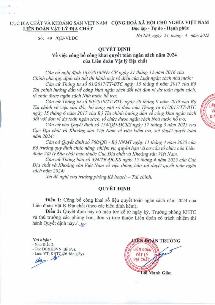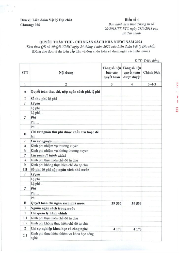 Công bố công khai quyết toán ngân sách nhà nước năm 2025 của Liên đoàn Vật lý Địa chất