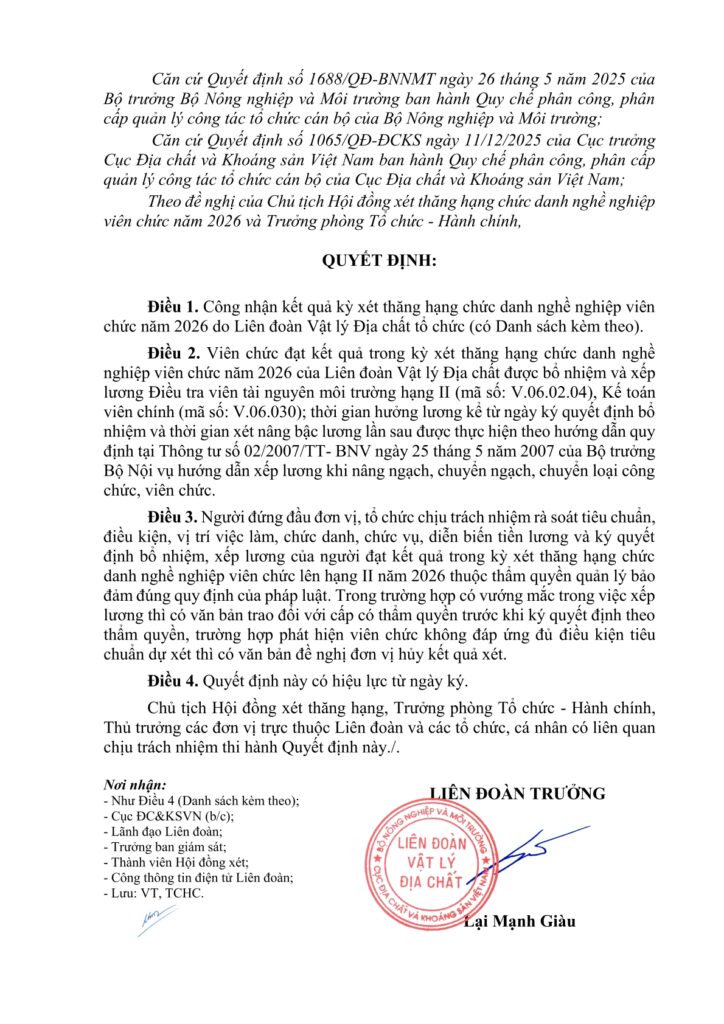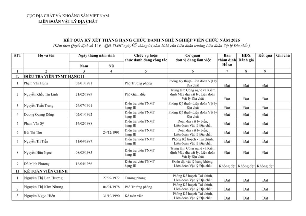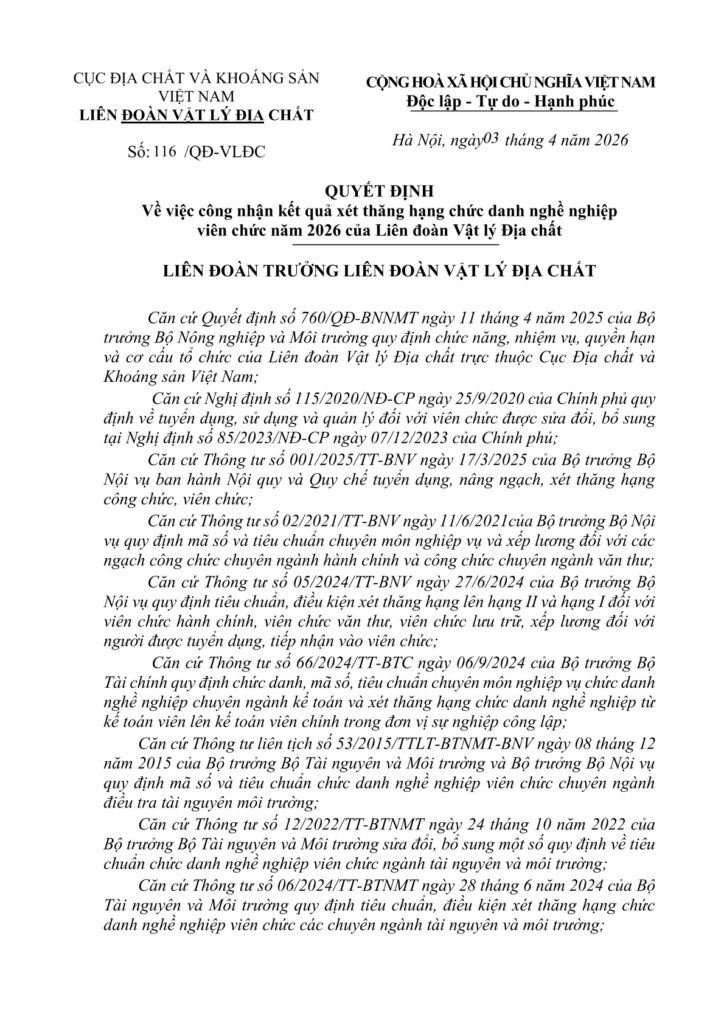 Thông báo Quyết định công nhận kết quả xét thăng hạng chức danh nghề nghiệp viên chức năm 2026 của Liên đoàn Vật lý Địa chất By VLDC 4 Tháng Tư, 2026 Không có phản hồi Share Tweet Pinterest LinkedIn Tumblr Email + Share. Twitter Facebook Pinterest LinkedIn Tumblr Email